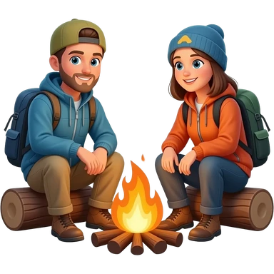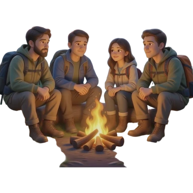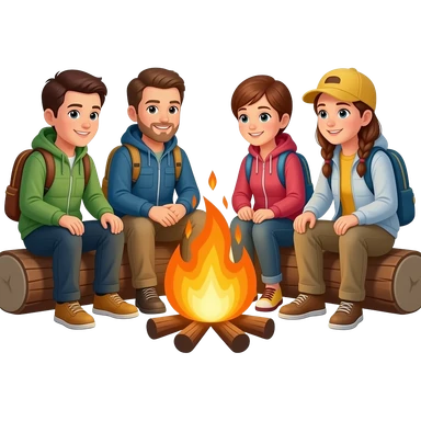 race men and women sitting around a campfire wearing camping clothing no visible backpacks emoji