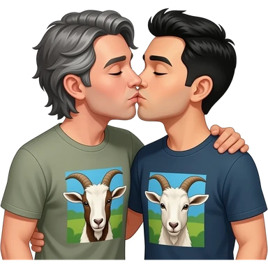 Two men with goat tee kissing passionately, one with a goat tee medium growth and gray hair and the other guy black hair with a black goat tee emoji
