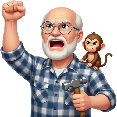 Angry old man wearing a plaid shirt with silver round glasses with with grey hair and no beard or mustache looking at the sky and shaking his fist at the sky with a hammer in his left hand with a angry baby monkey on his shoulder emoji | AI Emoji Generator