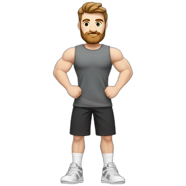 Full height Pale skinned fit man With biceps, brown hair and short beard In dark gray sleeveless mike, black oversize sports shorts, watch and white sneakers. his arms crossed over his chest emoji