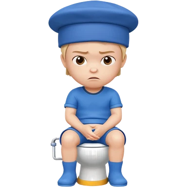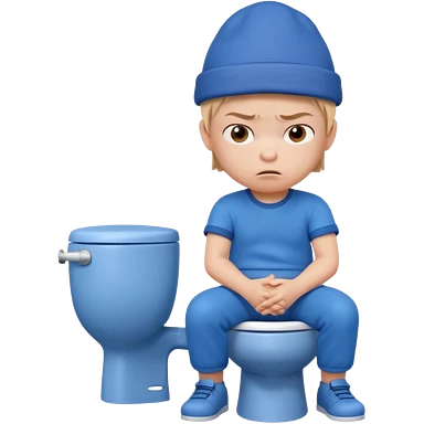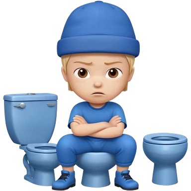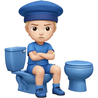 3D cartoon child character in blue outfit and blue hat, sitting on a toilet, looking angry with crossed arms, pastel background, preschool animation style." emoji
