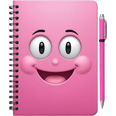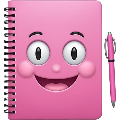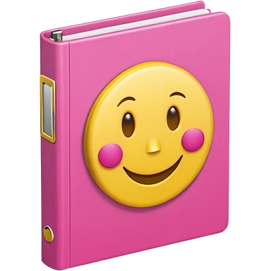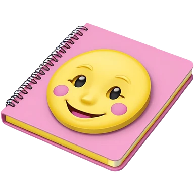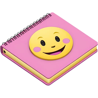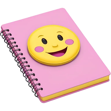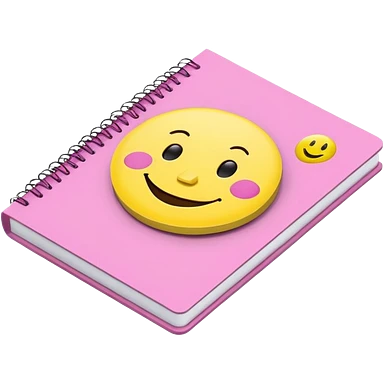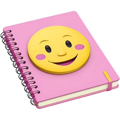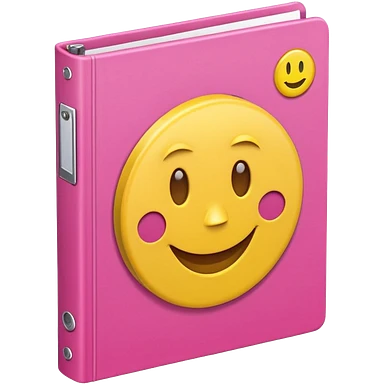 libreta de anillos rosada en perspectiva isometrica con sticker de carita feliz amarilla, sin rubor rosa, con aspecto de emoji de apple emoji