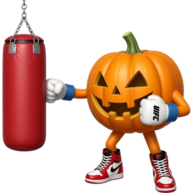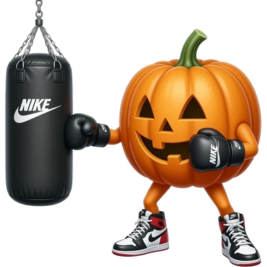 A standing pumpkin with Nike high tops and UFC gloves on hitting a punching bag emoji