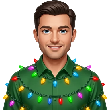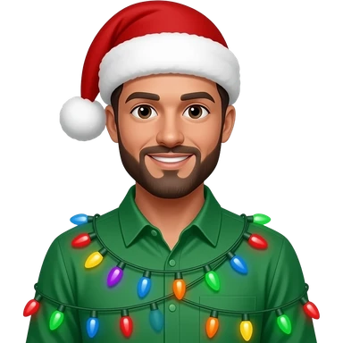 man wear christams dress with green shirt and add multi colors of christamazs light in his shirt emoji