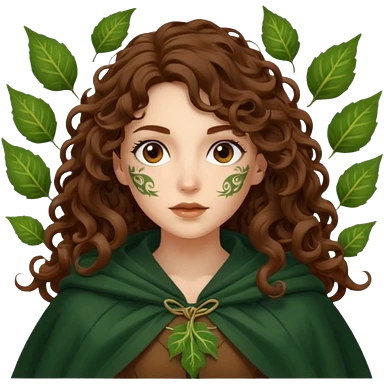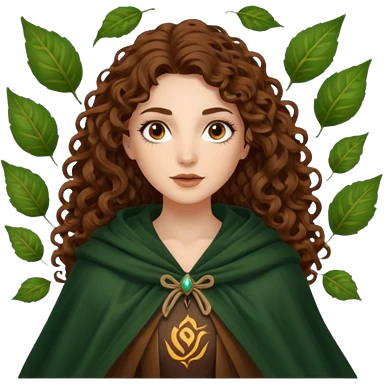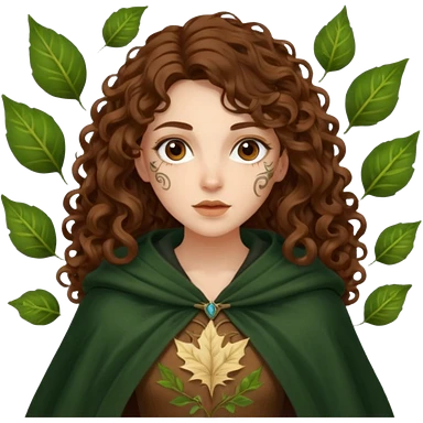 woman with long curly brown hair, brown eyes, white skin, tattoos, cloak made of animated leaves swirling emoji
