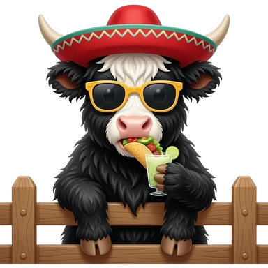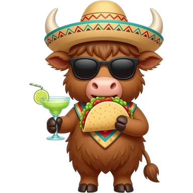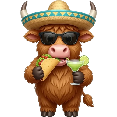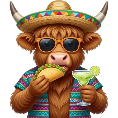 animated highland cow eating tacos and guacamole,wearing a pancho and sombrero drinking a margarita emoji | AI Emoji Generator