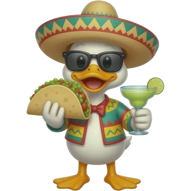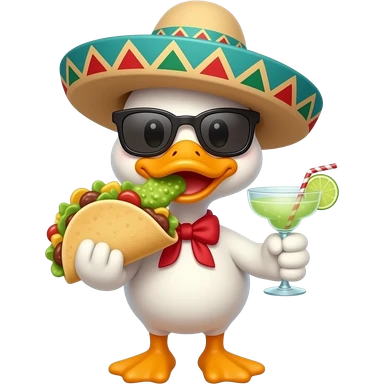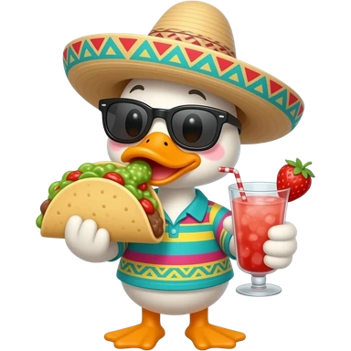 cute animated ducky eating tacos and guacamole,wearing a pancho sunglasses and sombrero drinking a margarita emoji