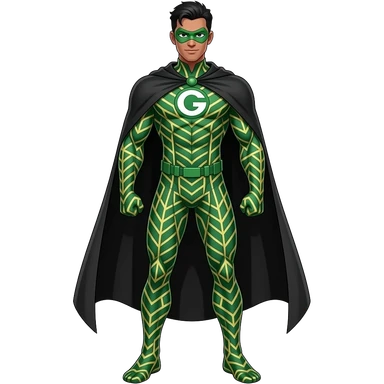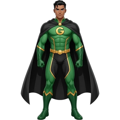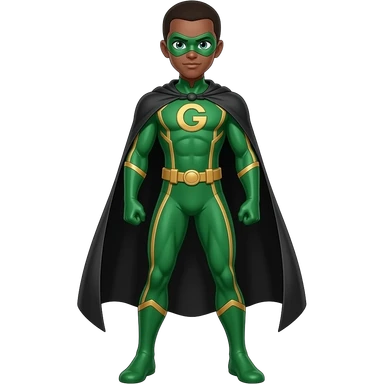 Anime men superhero suite brown skin green and gold lines long black cape and green face mask and letters G on the suite very tall full emoji
