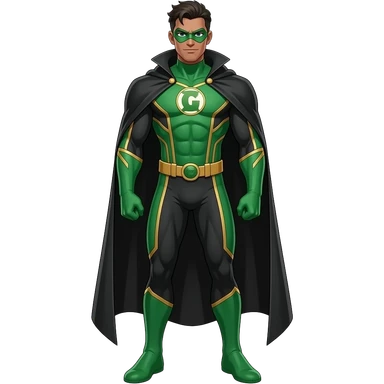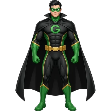 Anime men superhero suite green and gold lines long black cape and green face mask and letters G on the suite very tall full emoji