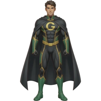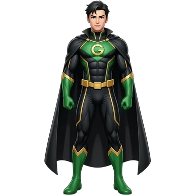 Anime superhero suite black green and gold lines long black cape and letters G on the suite very tall full body emoji