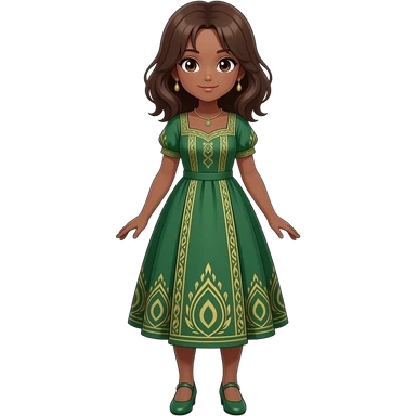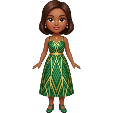 Anime female brown skin green and gold lines dress green shoes brown hair emoji