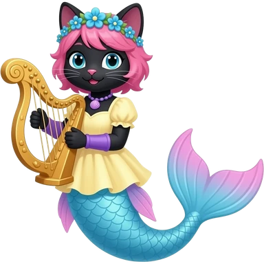 black femboy anthro cat with pink hair blue flower crown with light purple shell necklace light yellow dress attached to long light blue mermaid tail with pink fins purple gloves holding a golden harp emoji