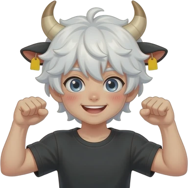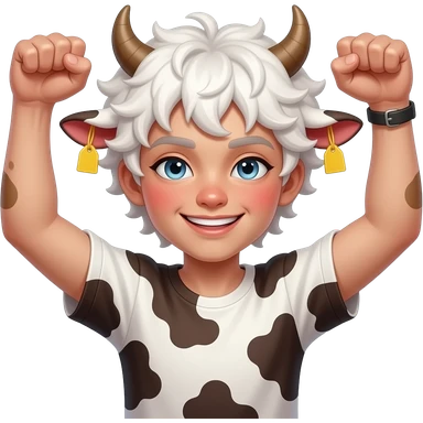 white-haired curly anime femboy with white eylashes with cow horns and cow ears with yellow tags in both cow ears poses in caramel dance pose with his fists up to his head with red blush on his cheeks emoji