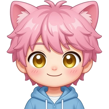 🎯 Основной (Blush / UwU — твой выбор №2) chibi anime catboy femboy, pink fluffy hair, cat ears, golden shiny eyes, heavy blush across cheeks and nose, uwu mouth, shy happy expression, looking slightly up, soft smile, pastel color palette, thick clean outline, emoji