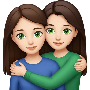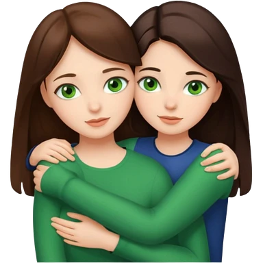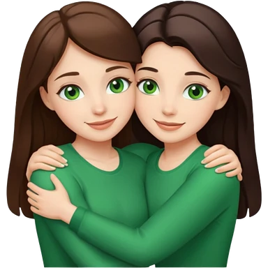 A brunette sister with green eyes and a brunette sister with green eyes in different clothes together hugging emoji