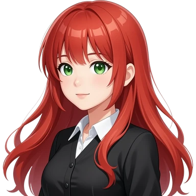 anime girl, fancy, red hair, green eyes, black blouse with white collar emoji