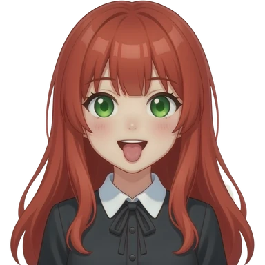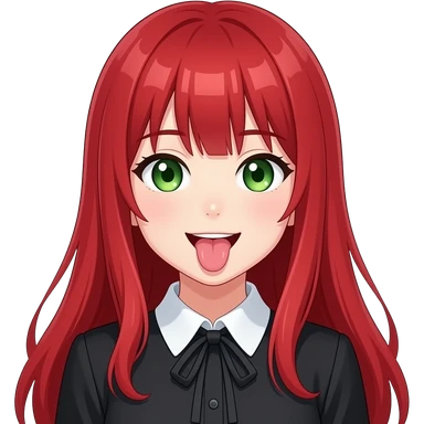 anime girl tongue out long red hair green eyes black blouse with white collar emoji