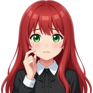 anime girl holding back tears long red hair green eyes black blouse with white collar emoji
