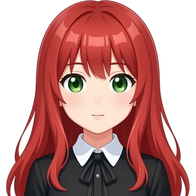anime girl looking to right long red hair green eyes black blouse with white collar emoji