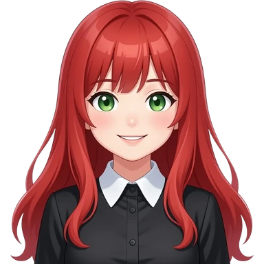 anime girl warm smile long red hair green eyes black blouse with white collar emoji