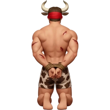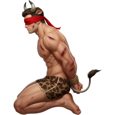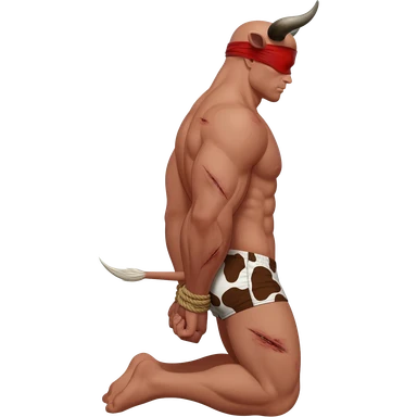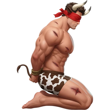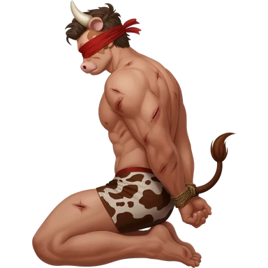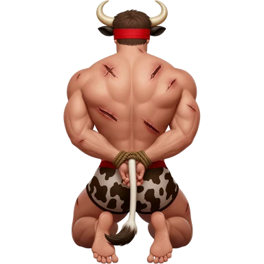 handsome extra large muscular man covered with scars with large breasts with bull horns and cow ears and bull tail with red blindfold dressed in thongs with brown cow print sits on his knees with hands tied behind the bback side view emoji