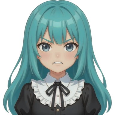 anime girl, angry, teal hair, grey eyes, black shoulder blouse with fancy white collar emoji