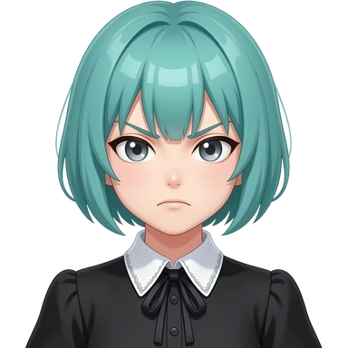 anime girl, angry, short teal hair, grey eyes, black shoulder blouse with fancy white collar emoji