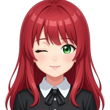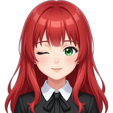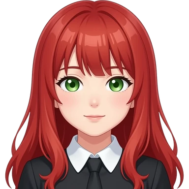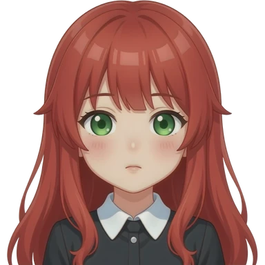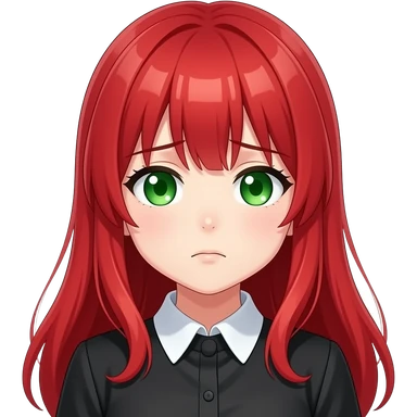 anime girl side eye long red hair green eyes black blouse with white collar emoji | AI Emoji Generator