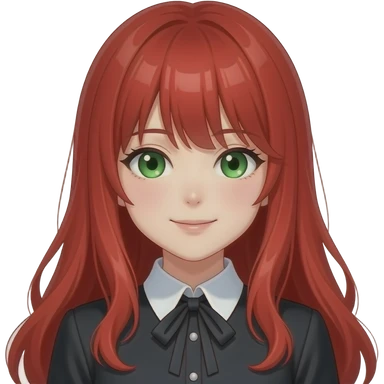 anime girl, fancy, red hair, green eyes, black blouse with white collar emoji