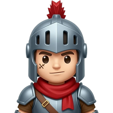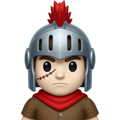 a white droblox character with a stiuched scar under his eye, with a knight helmet that has ared mohawk, and a red scarf and brown shirt emoji