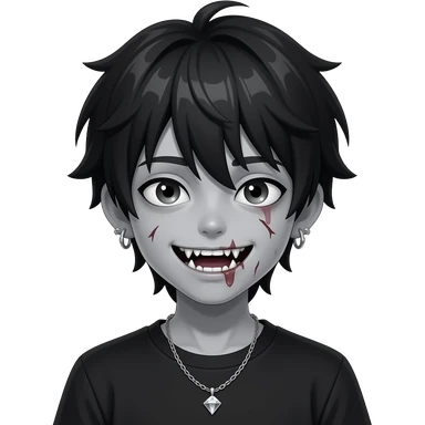 Black and white zombie teen boy with mouth being able to see teeth because he is a zombie make it have diamond grills and make him have black anime style hair with gray skin on blakc bg emoji