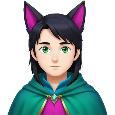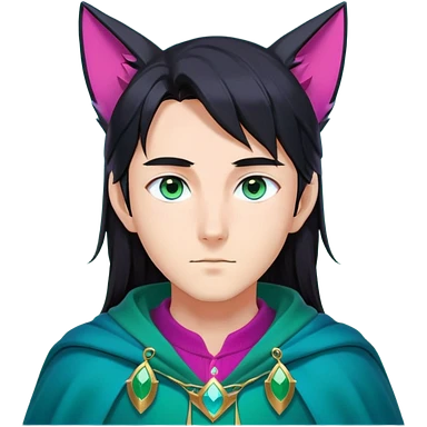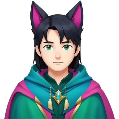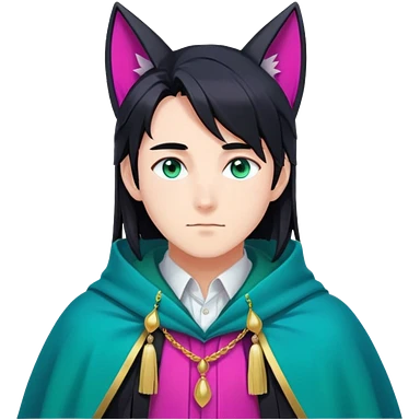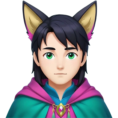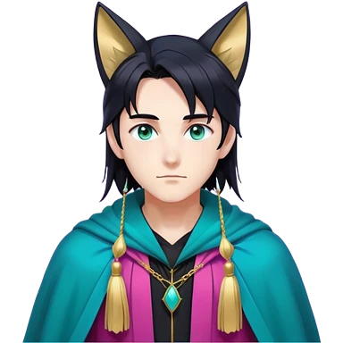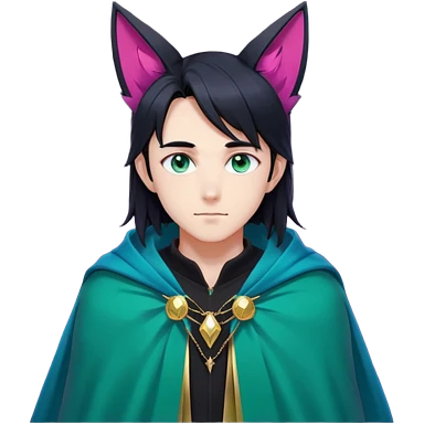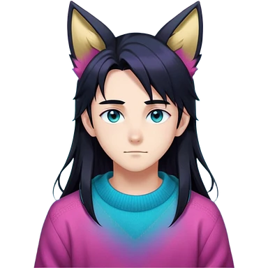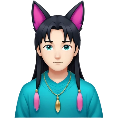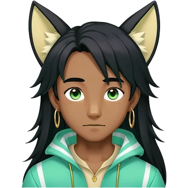 anime man with long-straight-dark-black-gradient hair with green accents, long black fox ears with pink Scapha, hazel-gradient-brown-turquoise eyes, gold earring, dark-blue-sweater, green cape, emoji | AI Emoji Generator