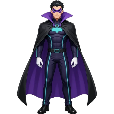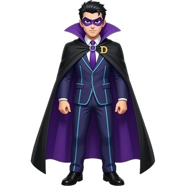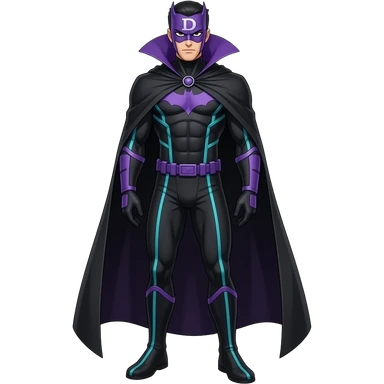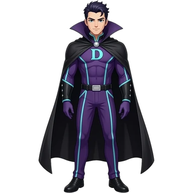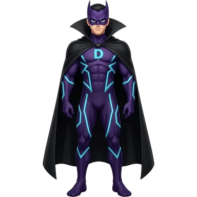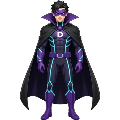 Anime men superhero suite look superstrong dark purple and cyan lines long black cape letters D purple masks full body emoji