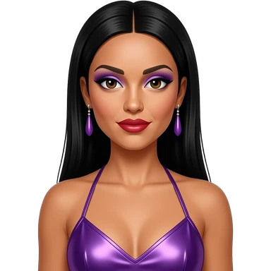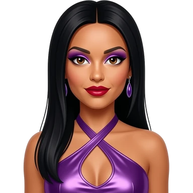 Nicole Scherzinger with dark brown eyes, long black straight hair, purple metallic halter crop top, pink metallic skirt, necklace and earrings emoji