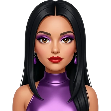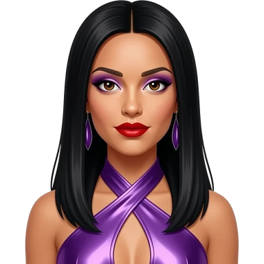 Nicole Scherzinger from The Pussycat Dolls with dark brown eyes, long black hair, purple eyeshadow, red lipstick, purple metallic halter dress, earrings emoji