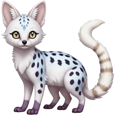 White Albino frosty snow-white whitish pastel-grey-spotted Serval-Civet-Genet-Trico-Furret-Linoone-Noibat-Espeon-Fakémon-Pokémon-animal-hybrid-fusion-creature (full body) with vibrant glowing eyes, cute, elegant, soft, realistic, pastel fur emoji