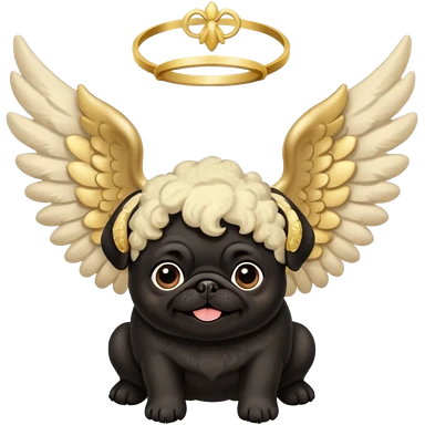 Black pug with big fluffy cream colored angel wings with gold dust on them emoji