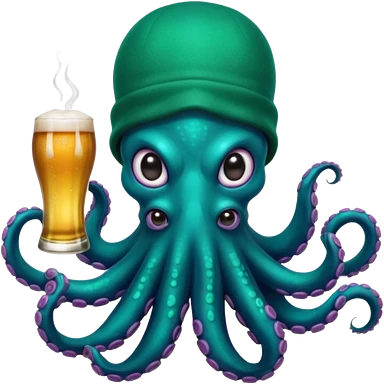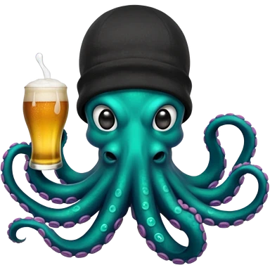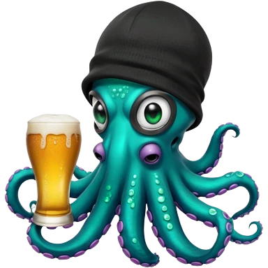 Epic octopus with an iridescent green base layer coloring and pearl black secondary layer of color, with teal neon colored suction cups under the tentacles. Octopus is wearing balaclava, a backwards hat, is holding 2 beers, and has a white teardrop face tattoo emoji