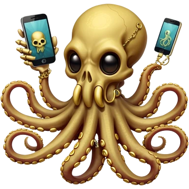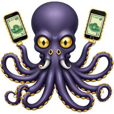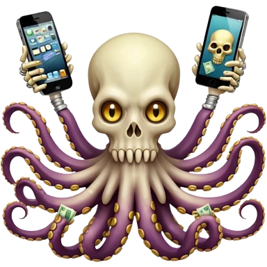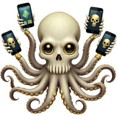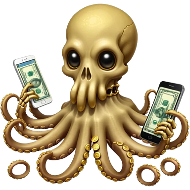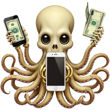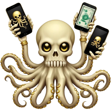 Intimidating octopus skeleton. Evil looking eyes, wearing a gold necklace. 3 tentacles are holding their own cellphone with one held to the side of its face as if its on a phone call, 2 other tentacles are holding stacks of money emoji