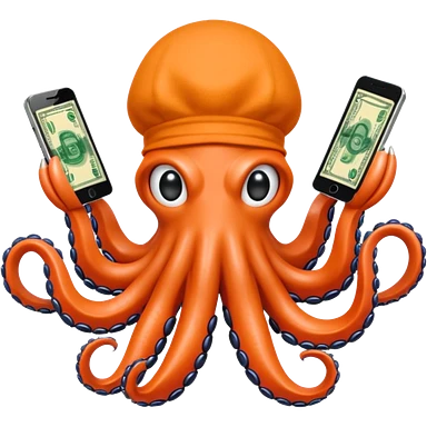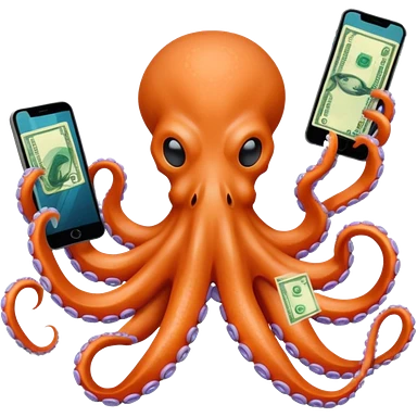 Intimidating octopus with pearl black skin, neon peach suction cups. Evil looking octopus is wearing a white face mask and thick gold necklace. 2 tentacles are holding their own cellphone, 2 more tentacles are holding stacks of money. emoji