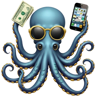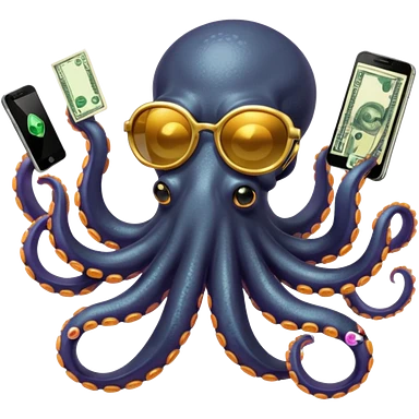 Intimidating octopus with pearl white skin, black suction cups. Wearing black mirrored sunglasses and a gold chain. 3 tentacles are holding their own cellphone with one held to the side of its face as if its on a phone call, 2 other tentacles are holding stacks of money emoji