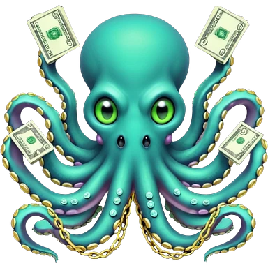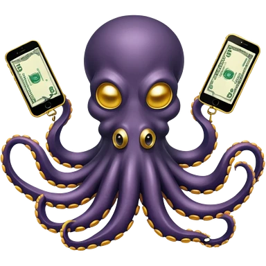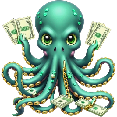Intimidating octopus with pearl black skin, neon suction cups. Evil glaring eyes. Wearing a thick gold chain. 2 tentacles are holding their own cellphone, 2 more tentacles are holding stacks of money. emoji