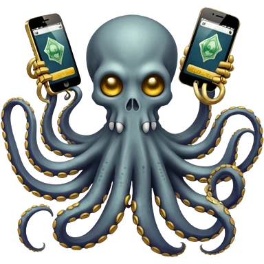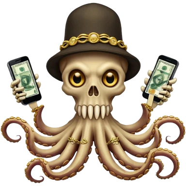 satanic octopus skeleton. Evil looking eyes, wearing a gold necklace and backwards hat. 2 tentacles are holding their own cellphones, 2 other tentacles are holding stacks of cash emoji