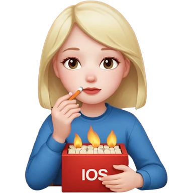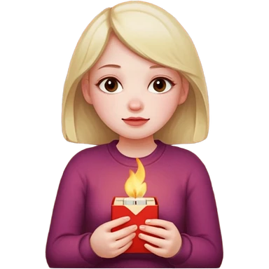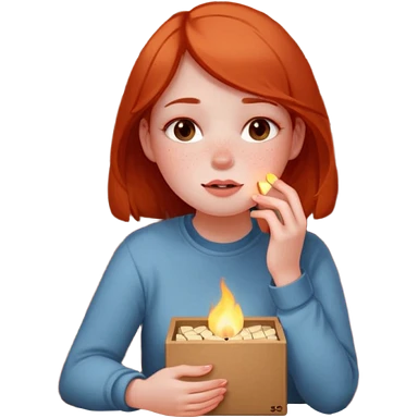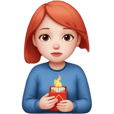 A fragile girl sitting beside a wall, clutching a box of matches, lighting one to warm her cold rosy cheeks. emoji