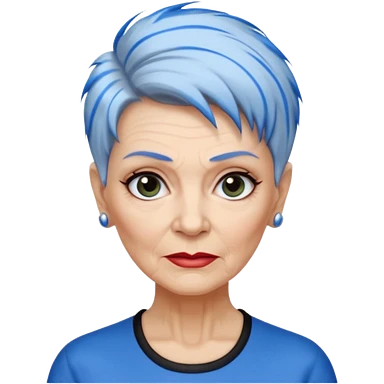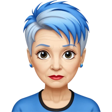 reife frau, achtzigJahre alt kein kind! freche extreme schwarze Kurzhaarfrisur eine Seite wirklich fast keine Haare andere Seite mit blauer Strähne kurze Seite noch viel kürzer emoji