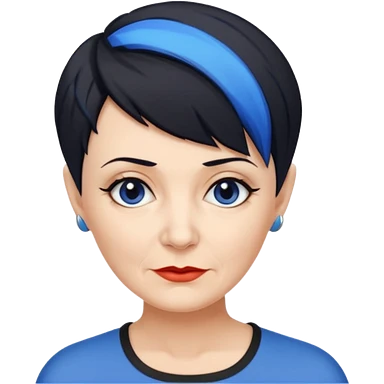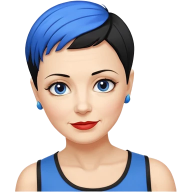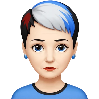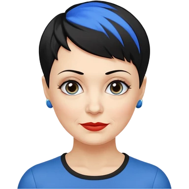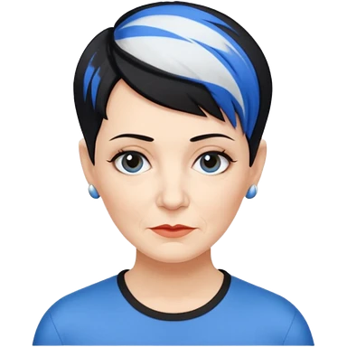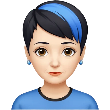 reife frau, kein kind freche extreme schwarze Kurzhaarfrisur eine Seite wirklich fast keine Haare andere Seite mit blauer Strähne kurze Seite noch viel kürzer emoji