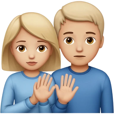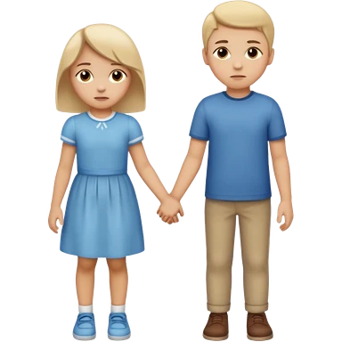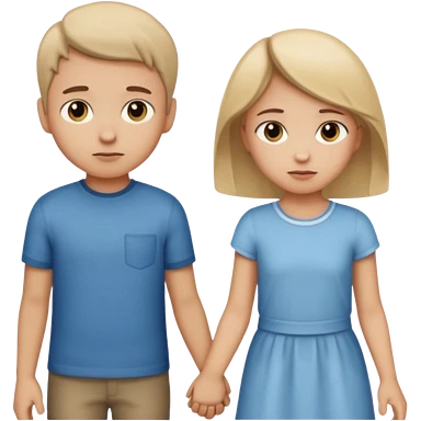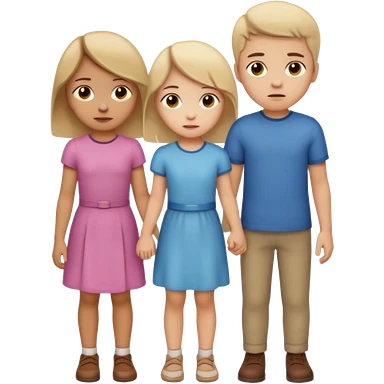 Apple iOS emoji style. A girl holding hands with two boys at the same time,one boy si brunette the other blonde, one on each side. The girl has a suspicious, guilty expression, slightly turned eyes. The boys look neutral and unaware. smooth gradients, rounded shape emoji