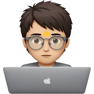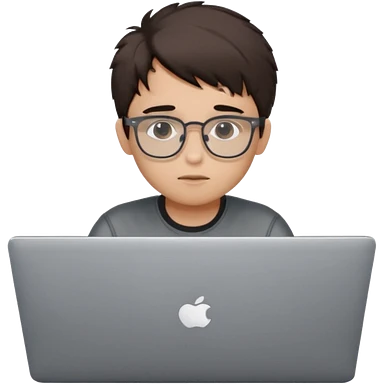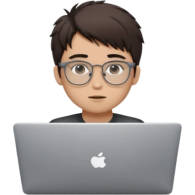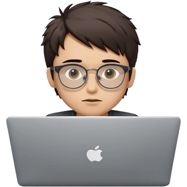 Apple Memoji-style 3D avatar, young man with light skin, short messy dark brown hair, black rectangular glasses, sitting behind a silver laptop with only eyes visible, cute minimal plastic look, smooth shapes, studio light, pure white background, centered, 1:1, ultra clean, 4k emoji