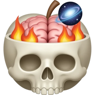 Apple-style emoji skull with an open head, brain bursting out with flames and a galaxy above it, smooth gradients, rounded shapes, clean and minimal, glossy finish, high contrast, centered, white background. emoji