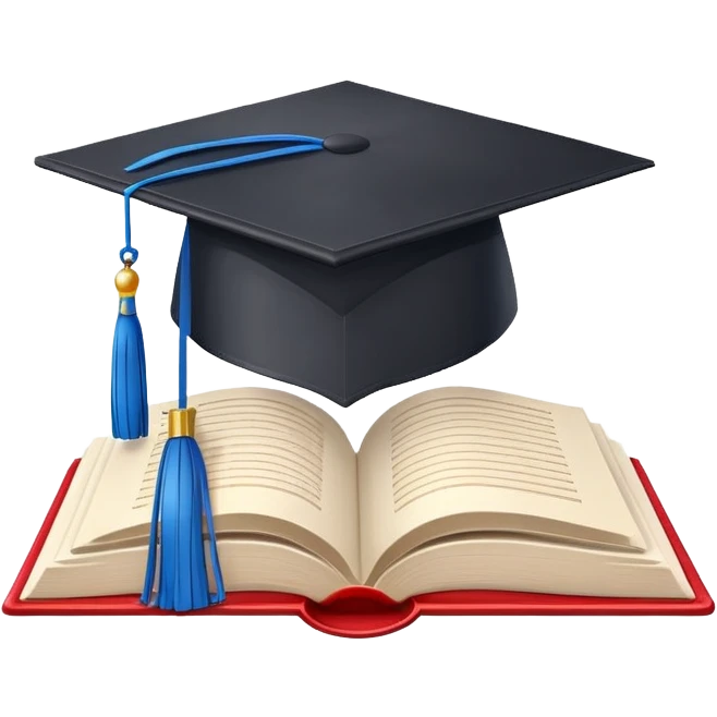Apple emoji style graduation cap with a blue tassel, floating above an open book, clean background, cheerful